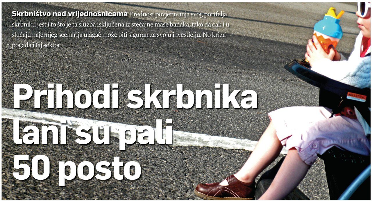 Prošle je godine njezin odjel obavljajući skrbničke poslove imao ukupne prihode od 7,5 milijuna kuna, što je i više nego zadovoljavajuće kad se zna da ta specifična služba ima samo sedam zaposlenika. Osim izvršenja transakcija, banka skrbnik svog klijenta obavještava o svim vrstama korporativnih akcija (dokapitalizacija, izmjena sjedišta tvrtke i sl.) i prikuplja za njega financijska sredstva od vrijednosnih papira (dividende ili isplata kamata) na ime obveznica. Dodatne su usluge koje pružamo na zahtjev klijenta i zastupanje i glasovanje na skupštinama društava čije dionice klijent posjeduje, ako on to želi. Služba skrbništva obavlja i usluge namire transakcija za naše klijente, što u određenim slučajevima klijentima pruža veću sigurnost i manji stupanj rizika da su prošna strana neće ispuniti svoj dio posla – prepustiti vlasništvo nad vrijednosnim papirima ili isplatiti ugovorenu svotu novca za transakciju – kaže Smolić.