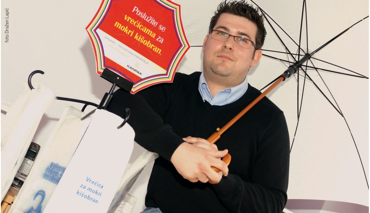 S lijeđeći svjetski trend brige o kupcima, njihovoj sigurnosti i ugodi te svoj moto ‘inovativno pakiranje’, mala zagrebačka tvrtka Kanpak obogatila je hrvatsko tržište posve novim i neočekivanim proizvodom – vrećicom za mokre kišobrane. Namjena tog proizvoda prilično je jednostavna: ima funkciju navlake u kojoj se zadržava kapljice kiše. – Odlučili smo napraviti nešto novo u biznisu fleksibilne plastične ambalaže, nešto što bi nas izdvojilo od drugih i učinilo prepoznatljivima – objašnjava Hrvoje Kantura, direktor i suvlasnik tvrtke koja se bavi fleksibilnom plastičnom ambalažom i čiji su proizvodi već našli svoje mjesto pod suncem u velikim trgovačkim centrima poput Avenue Malla i Garden Malla.