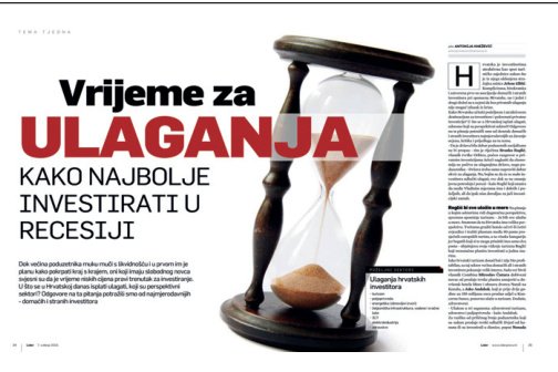 VRIJEME ZA ULAGANJA\nKako najbolje investirati u recesiji\n\n## 5 EKONOMIJA\nMiodrag Šajatović o nekritičnosti Premijerkin optimizam još nema ozbiljnog pokrića\n\n## 8 TEČAJ\nPad eura Veliki dobavljači počeli naplaćivati robu u dolarima\n\n## 14 AKTUALNO\nMilinović vs. osiguravatelji HZZO postaje nelojalna konkurencija osiguranjima\n\n## 17 POLITIČKA SEKCIJA\nVišnja Starešina o bivšem ministru Kako će Ivan Šimonović ipak urazumiti Brammertza\n\n## 18 INTERVJU\nDanko Končar, investitor Od brodogradilišta sam odustao, zanimaju me nekretnine i marine\n\n## 21 PROJEKTI\nOsvjetljenje dubrovačkih zidina Od ulaznica za noćni obilazak zarada dodatnih 7,5 milijuna\n\n## 22 KONKURENTI\nBritvice i brijaci Lako je P&G-u biti tržišni lider kad zastupa Gillette\n\n## 30 LIK I DJELO\nIvica Matošević, osnivač Vinistre Istarski vinar za Ligu prvaka\n\n## 32 PODUZETNICI\nBranko Žufika, Gospodarski klub Pad prometa u jednom restoranu nadoknadio otvaranjem još jednoga\n\n## 36 KOMPANIJE\nAdris grupa Energetika bi mogla biti treći stup nakon duhana i turizma\n\n## 39 OPINION MAKER\nMarijan Ožanić o strategiji izvoza Za veći izvoz treba angažirati već prokušane izvoznike\n\n## RUBRIKE\n\n| 6 | KONTEKSTI |\n|—|—|\n| 10 | DOIGRAVANJE |\n| 34 | SLK |\n| 52 | MOB. MENADŽER |\n| 53 | HI-TECH |\n| 60 | LIFE COACH |\n| 61 | STIL ŽIVOTA |\n| 65 | ZDRAVLJE |\n| 68 | BURZE |\n| 71 | UKRATKO |\n| 72 | KARIJERE |\n| 73 | KRONIKA |\n\n—\n\nNOVE PROFESIJE\nEtički haker Novi James Bondovi po svijetu s kompjutorima umjesto s ljepoticama\n\nRAZGOVOR\nArnauld Leclerc Citroën će biti imnogo ofenzivniji u B2B prodaji vozila tvrtkama\n\nSAVJETNIK\nUpravitelji zgrada Zakon obvezao da etažiranje počne, ali ne i da se dovrši\n\nMARKETING\nOprah Winfrey Network Kraljica talk showa u novome medijskom pohodu\n\nPOSLOVNA ZNANJA\nNeuroekonomija Uvid u moždane vijuge partnera ili klijenta dovodi do boljih odluka\n\nSVIJET\nObama Kovčeg mjera za obuzdavanje Wall Streeta mogao bi ostati samo na ručki\n\nFELJTON\nSamuel Palmisano Njegovoj viziji IBM duguje ‘zeleni’ povratak među najveće\n\nPRAVDA ZA SVE\nIvica Grčar o proizvodnji doušnika Državno odvjetništvo traži da im dokaze pribavljanju novinari\n\n—\n\nPOSEBNI PRILOZI\nAutotrend\nZdravi i aktivni\n\n—\n\nLider\nwww.liderpress.hr\n\n—\n\n5/5/10 12:16:30 PM