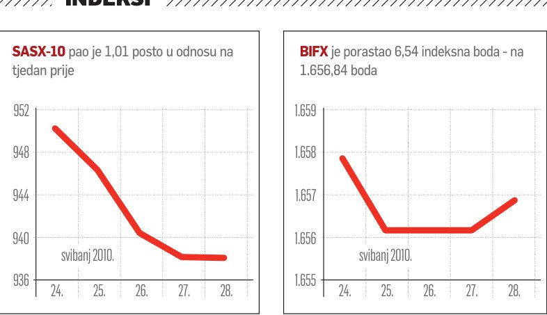 Na Sarajevskoj je berzi prošli tjedan ostvaren promet od 1,360.684 KM. U sklopu 308 transakcija ukupno se trgovalo s 974.824 vrijednosna papira. Minimalno jedna trgovina obavljena je s 45 emitentata. Porast vrijednosti službenog tečaja ostvarilo je 11 emitentata, a pad 19. Indeks BIFX porastao je 6,54 indeksna boda na 1.656,84 boda, što je u odnosu na tjedan prije porast od 0,40 posto. Vrijednost indeksa SASX-10 pala je 9,56 indeksnih bodova na 937,97 bodova, što je u odnosu na prošlotjedno trgovanje pad od 1,01 posto. I SASX-30 je pao, i to 14,67 indeksnih bodova na 985,19 bodova, što je na tjednoj razini pad od 1,47 posto.