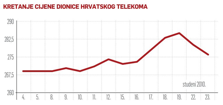 Crobex je pao za 1,08 posto na 1.842,48 bodova, a Crobex10 za 0,66 posto na 983,62 boda. Ako se trend nastavi, postoji realna mogućnost da Crobex padne ispod granice od 1.800 bodova. Redoviti promet dionicama bio je 96,91 milijun kuna, prijavljeni 23,18 milijuna kuna, institucionalni 49,78 milijuna kuna, a ukupni promet 169,88 milijuna kuna. Dionicu HT-a bile su najlikvidnije s prometom od 24,2 milijuna kuna. Ostvarile su i visok tjedni rast cijene od 4,1 posto na 283,31 kunu po dionici. Dionicu Atlantic grupe ostvarile su promet od 5,5 milijun kuna iako im je cijena smanjena na 810 kuna po dionici.
