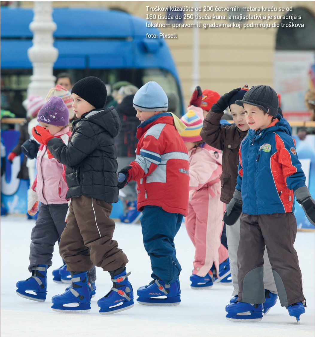 I, doista, ostale tvrtke koje se pojavljuju poput slovenske Kote i austrijskog Alpine Baua (Tuškanac i Arena u Zagrebu), nizozemskog Ice Worlda (Split), domaćih Protecta (Rijeka) ili Tigre uglavnom iz osnovnih djelatnosti (građevine, rashladnih uređaja, zaštitarske djelatnosti) razvijaju i ovu vrstu ponude. No postavljanje leda samo je početak uspješne poslovne ili marke priče o klizalištima, pa ako projekt nije zaokružen sadržajima i kvalitetom izvedbe, lako se pretvori u fijasko poput sedmodnevog kašnjenja otvorenja, što se dogodilo u Splitu ili nešto drugo.