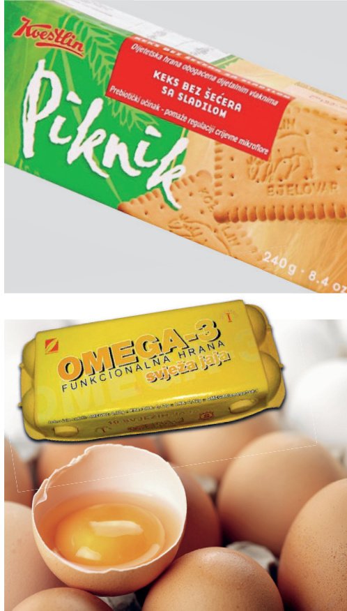 Nedovoljna educiranost i kriza. Nataša Švast, direktorica Odjela za razvoj i proizvodnju u IBCC-u, riječkoj tvrtki koja proizvodi supstancije za funkcionalnu hranu i farmaceutike nove generacije, kaže da je na domaćem tržištu primjetan lagan rast, i to zato što je samo nekoliko tvrtki prepoznalo prednosti funkcionalne hrane – Agrokor s Jamničinim ‘smart drinks’ i Zvijezdinim Omegol uljem, margarinom i majonezom, Vindija s probiotičkim jogurtima, mlijekom, napicima iz GI control linije, pića Vindi vital, Podravka sa Studenom GO, Defence, Shine funkcionalnim vodama, Dukat s probiotičkim jogurtima i mlijekom, Marijačanka s jajima s omega-3 kiselinama.