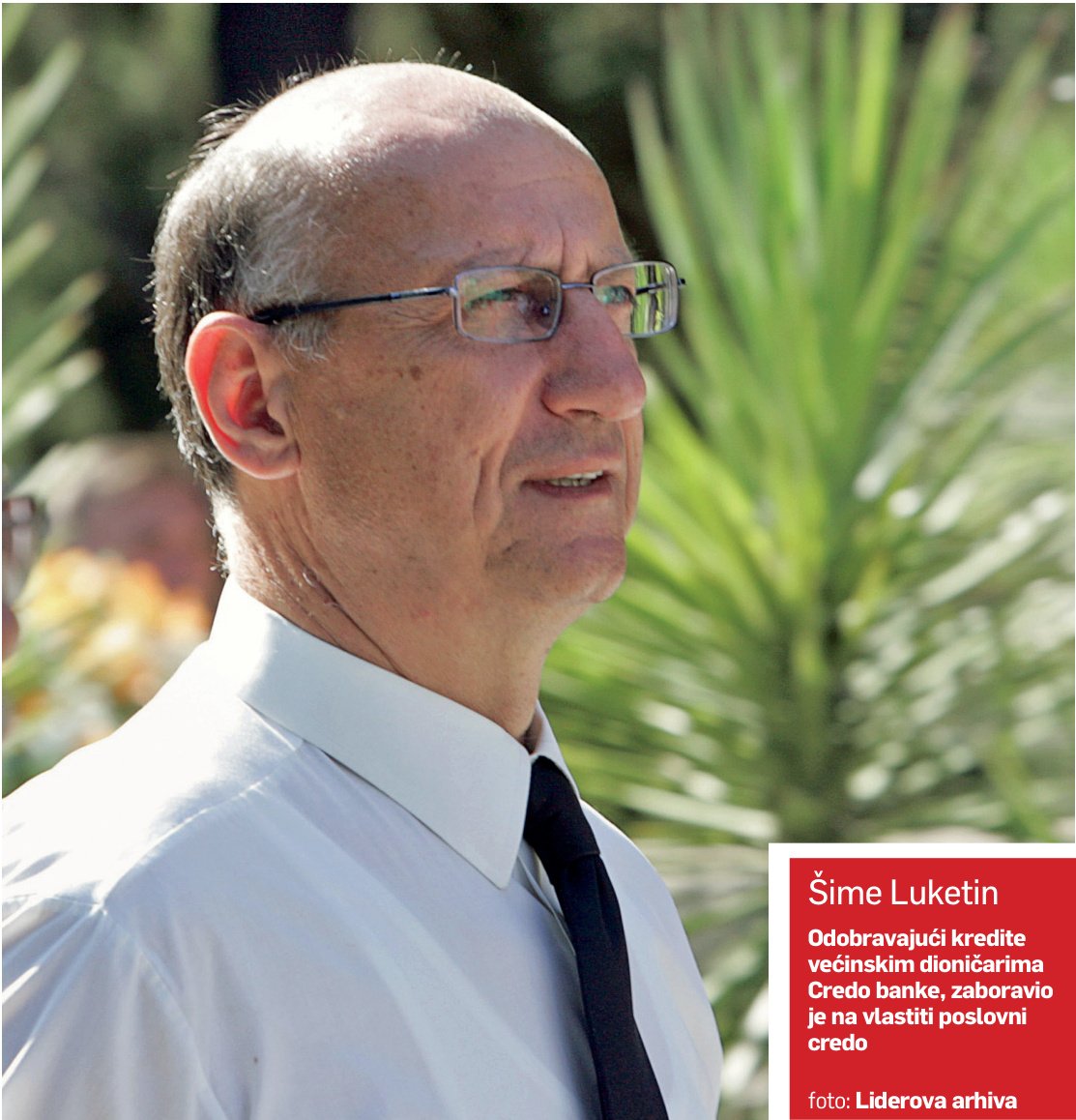 Jednom je prigodom predsjednik Uprave Credo banke Šime Luketin ispričao da je poslovna strategija njegove banke osobno pristupiti klijentu radi detaljnog upoznavanja s njegovim poslovanjem te fleksibilnim pristupom osigurati mu kredit. Međutim, napominje Luketin, fleksibilan pristup klijentu nikada ne smije ugroziti postulat sigurnosti, što zahtijeva veći angažman uprave! Na nesreću, Luketin je zaboravio na postulate sigurnosti kada su u pitanju bili krediti koje je odobravao tvrtkama svojih poslodavaca, većinskih dioničara Credo banke. Njima nije znao reći ‘ne’ i banka je završila u prisilnoj likvidaciji.