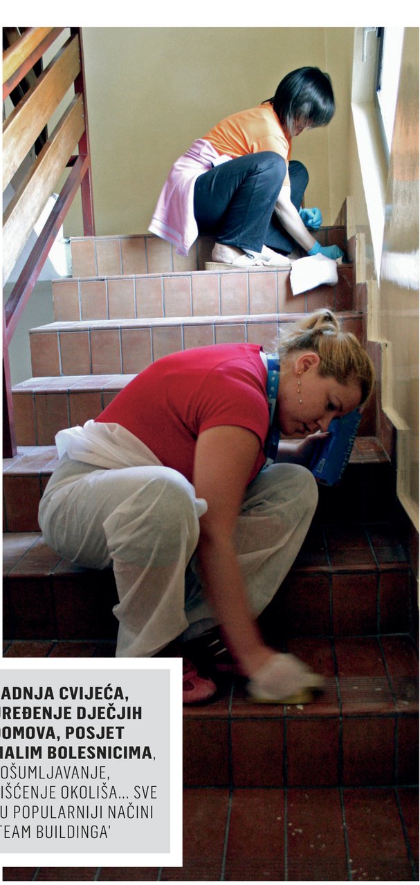 I ako su u provedbi aktivnosti kojima se radnici potiču na volontiranje ili ‘team buildinge’, u sklopu kojih se radi nešto korisno za lokalnu sredinu, najaktivnije podružnice stranih tvrtki (npr. Unilevera, KPMG-a, Metroa, dm-a, Ernst&Younga, Erste&Steiermäksiche banke, Microsofta), danas se već može reći da je doprinos društvenoj zajednici trend koji je zahvatio gotovo cijelu domaću poslovnu zajednicu. Riječ je o aktivnostima namijenjenima izgradnji tima ili ekipa koji ne obuhvaćaju samo profesionalnu edukaciju, razmjenu korisnih informacija ili veslanje na raftingu nego i društveno korisne projekte čiju dobrobit najviše osjećaju pojedinci i neprofitni sektor. Oni se uglavnom postižu tako da se zaposlenici bave društvenim akcijama koje nisu blisko povezane s njihovim područjem rada, ali kojima se udovoljava gorućim potrebama sredine u kojoj njihova tvrtka ima bazu.