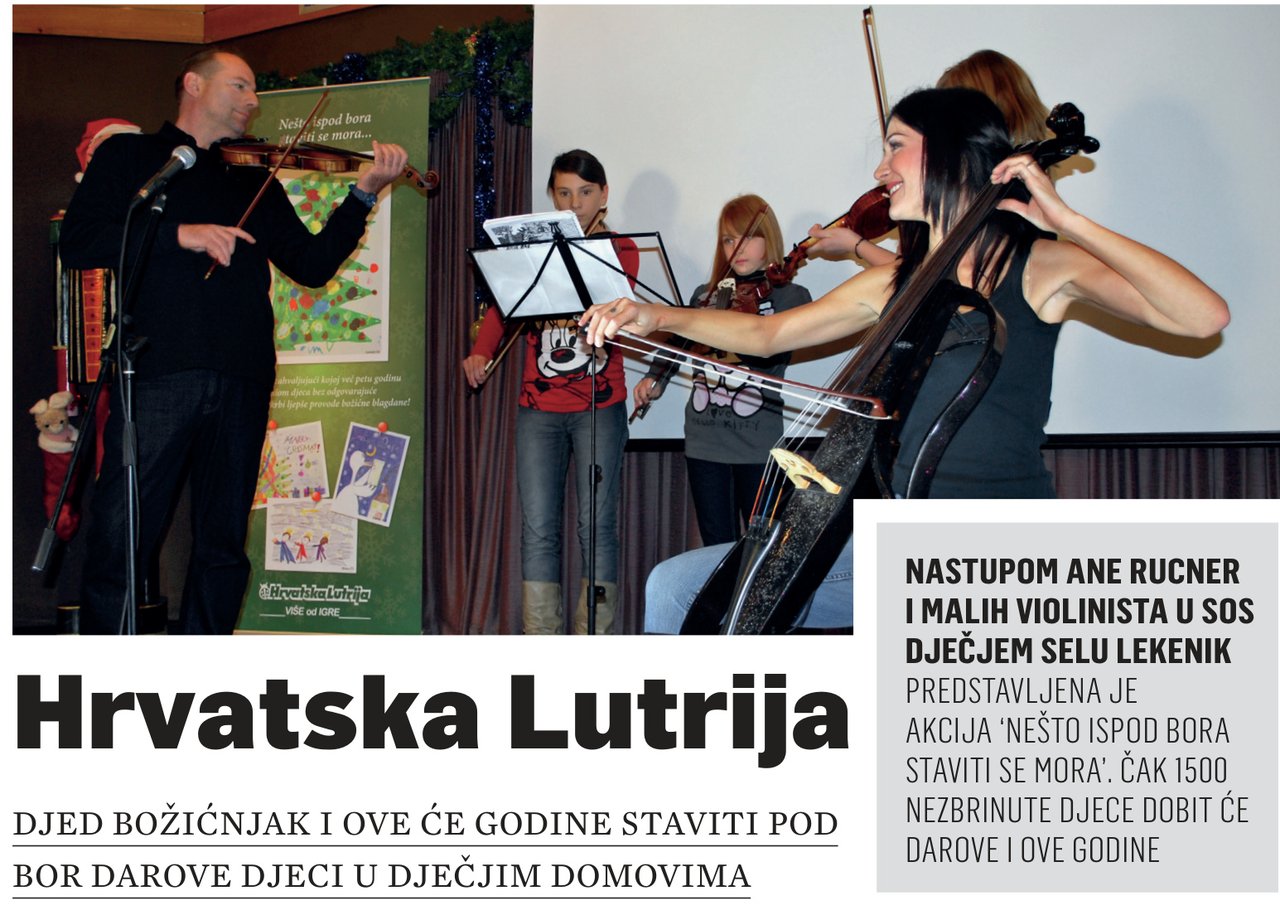 Prošlog je tjedna u SOS Dječjem selu Lekenik nastupom Malih violinista SOS Dječjeg sela Lekenik i proslavljene hrvatske violončelistice Ane Rucner svečano predstavljena humanitarna akcija Hrvatske Lutrije ‘Nešto ispod bora staviti se mora’. Na svečanosti u Dječjem SOS selu Lekenik, uz djecu i voditelje Sela bila je Vesna Bakran, predsjednica Uprave Hrvatske Lutrije. Tvrtka već petu godinu zaredom organizira humanitarnu akciju ‘Nešto ispod bora staviti se mora’ u sklopu koje se prodajom Božićne sreće dio prihoda izdvaja za božićno darivanje djece i mladih bez odgovarajuće roditeljske skrbi, korisnika dječjih domova diljem Hrvatske. Ta će humanitarna akcija i ove godine razveseliti 1500 djece i mladih u 25 dječjih domova, SOS sela i udomiteljskih obitelji za koje je mjerodavno Ministarstvo zdravstva i socijalne skrbi.