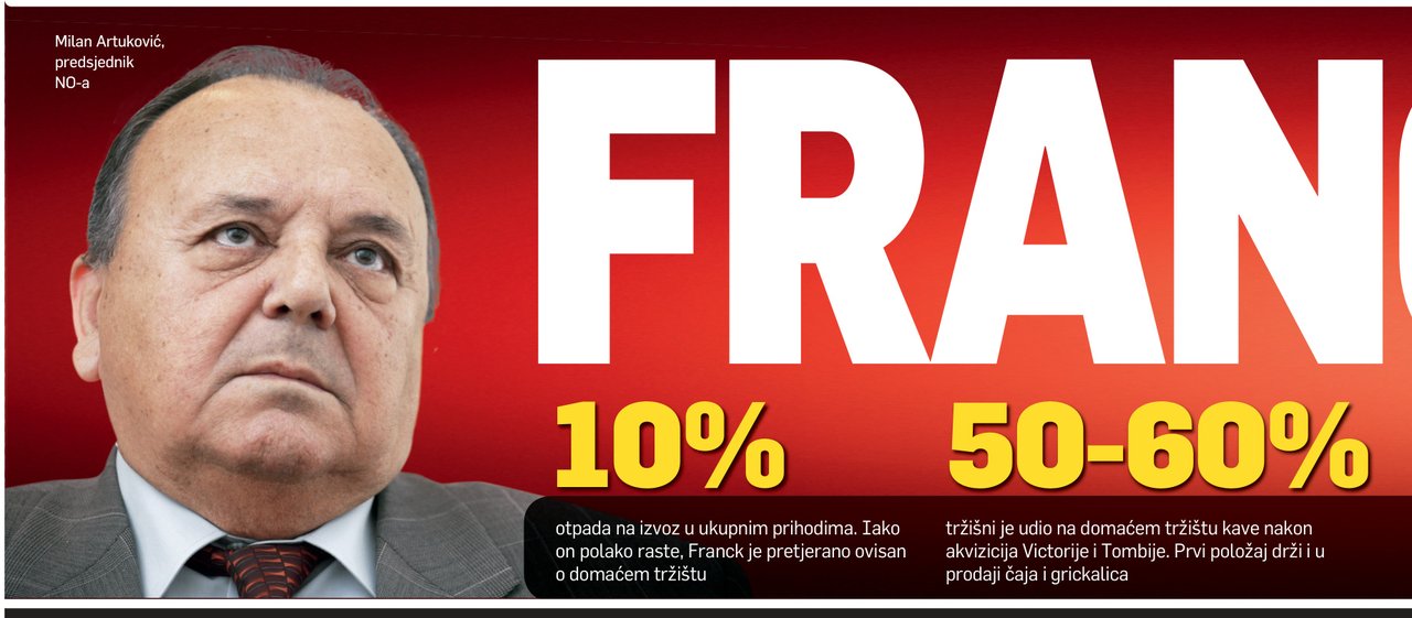 Kako dalje? Predsjednik Uprave i sin većinskog vlasnika Dubravko Artuković snažnije Franckovo pozicioniranje vidi ponajprije u kanalu HoReCe. Tu možemo biti igrač broj jedan. Početkom iduće godine počet ćemo primjenjivati učinkovitije modele distribucije, a sličan razvoj planiramo i na tržištima Albanije, Kosova i Makedonije – kaže Artuković.