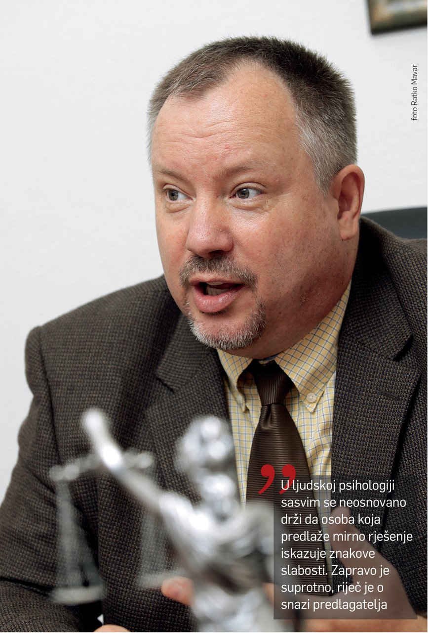 Ukazujete na uspješnost mirenja, ali pretpostavljaj da ima i neuspješnih mirenja nakon kojih se sve samo još više zakomplicira i oteža i redovno sudsko rješavanje spora? Mi izmiritelji volimo reći da nema neuspješnih mirenja. Ako se nagodba ne sklopi, predmet se vraća parničnom sucu na odlučivanje. Tada stranke ponovno ispuštaju kontrolu nad svojim sporom i dopuštaju da o njima odlučuje netko treći. Mirenje bez nagodbe u pravilu je blagotvorno jer su stranke nakon dugo vremena imale priliku međusobno komunicirati, izmijeniti stavove i približiti barem neka od spornih pitanja te time znatno ublažiti početnu suprotstavljenost koju parnica razbukta. Na taj način i unatoč nastavku parnice imaju priliku spasiti svoj odnos. U SAD-u istraživanja pokazuju da je od zadržavanja staroga poslovnog partnera i do šest puta skuplje pronaći novoga. Jednako tako, drži se da je neizvjesno suđenje za gospodarstvenike višestruko rizičnije od rizika njihovog poslovanja na tržištu.