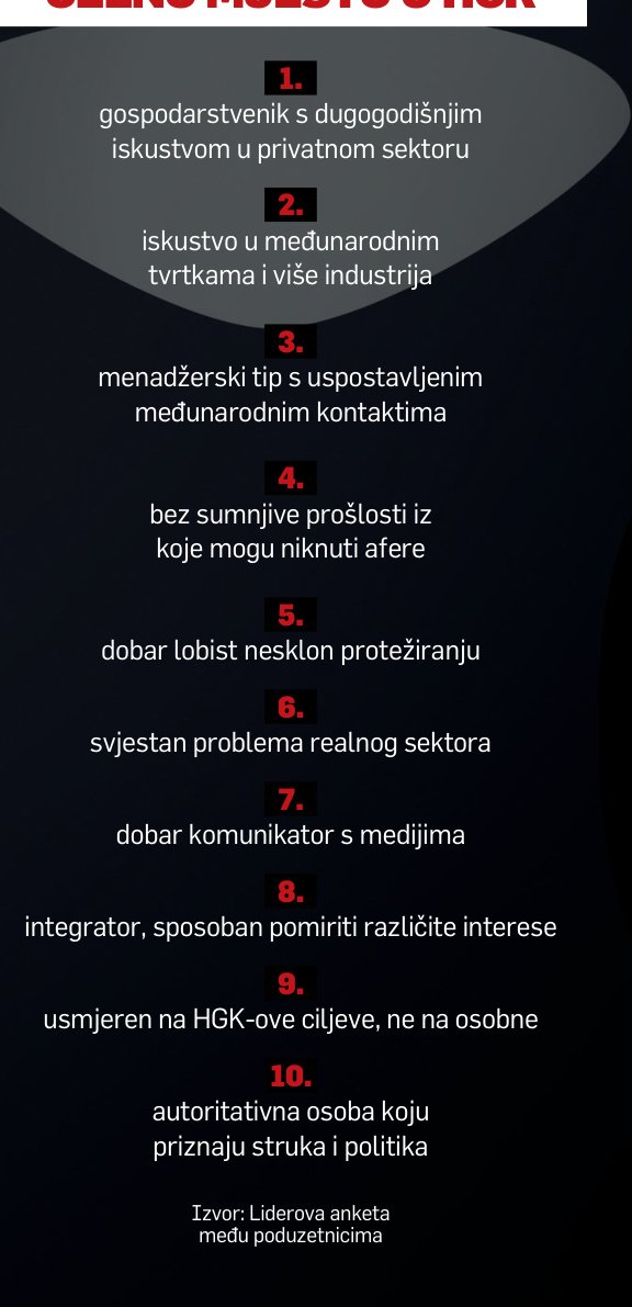 Ključna dvojba poduzetnika je treba li šef HGK doći iz velike privatne ili multinacionalne kompanije, ili će tako previše biti korporativni igrač. Isto tako, podijeljeni su u razmišljanjima treba li imati jako političko zaleđe ili bi mu to bio dodatni problem.