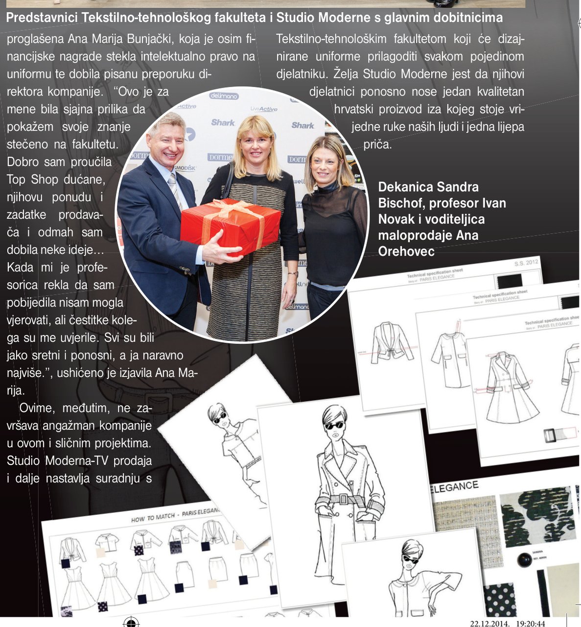 Stoga je u rujnu pokrenuta suradnja između Studio Moderne i Tekstilno-tehnoškog fakulteta u Zagrebu kroz nagradni natječaj „Osvoji džeparac i izradi karijeru!“. Zadatak je bio zaista zahtjevan i uključivao je puno kriterija, spomenula je voditeljica maloprodaje, Ana Orehovec, uručuje glavnu nagradu dobitnici Ani Mariji Bunjački.
