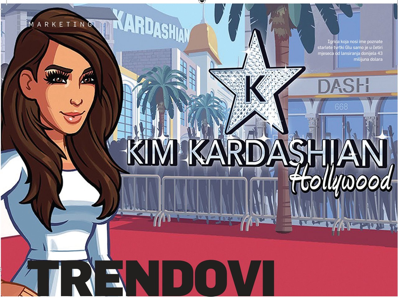 Zlatna koka za plasman svojih proizvoda tvrtkama posljednjih je godina i starleta Kim Kardashian, koja je u 2014. utrošila svoje bogatstvo. Golemu zaradu priskrblilo joj je partnerstvo s Gluom, tvrtkom koja također lansira mobilne igrice. Igrica koja nosi starletino ime Gluu je samo u četiri mjeseca od lansiranja donijela 43 milijuna dolara, četiri puta više od njegove drugopljasirane igrice ‘Deer Hunter 2014.’. ‘Kim Kardashian: Hollywood’ funkcionira slično kao ostale ‘überpopularne’ igrice. Korisnici aplikaciju preuzmu potpuno besplatno, a zatim se igraju života poznate starlete i njezinih prijatelja (uglavnom obilaze zabave i šoping-centre). Budući da za napredovanje u igrici treba proći neko vrijeme, a igrači su često nestrpljivi, skraćuju ga pravim dolarima. Na tim ‘in-game boostima’ okreću se nevjerojatni iznosi. Primjera radi, prošle milijarde dolara. Na drugom je mjestu prema zaradi igrica ovisnička igrica ‘Candy Crush’. Tvrtka King Digital Entertainment’s nudi je besplatno, a diže novac na prodaji ‘života’. U prosjeku riječ je o 884 tisuće dolara koje igrači diljem svijeta potroše na zadovoljavanje svoje ovisnosti o šarenim puzzloma. Da se dijele medalje za najveće prihode, ‘Game of Wars’ s prosječnim dnevnim prihodom od 572 tisuće dolara osvojio bi broncu. Tu je riječ o još jednoj strateškoj igrici u kojoj korisnici grade carstvo, treniraju svoje junake i vođe bitke za kraljevski tron. Kako bi osnažili svoje carstvo, pravim dolarima kupuju dodatno zlato. Aplikacija je poznata po nevjerojatnoj sposobnosti uvjeravanja korisnika da će im to zlato pomoći da uspiju u svom naumu, pomognu svojoj virtualnoj zajednici podređenih te impresioniraju ostale igrače na zemaljskoj kugli. Taj suludi, nestvarni osjećaj ponosa i/ili borbe za tron u nepostojećem kraljevstvu zaista može natjerati korisnike da iskeširaju do sto dolara za virtualno zlato.