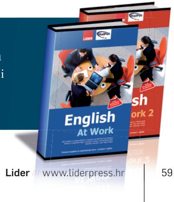‘English at Work 1 i 2’ – lekcije objavljene u Lideru možete naći u dva izvrsna priručnika za učenje poslovnoga engleskog jezika. Sadržavaju presjek čestih poslovnih tema, od onih iz financija, poslovnih odnosa i marketinga, odnosa s javnošću do onih koje se bave uspješnim komuniciranjem u poslovnom okružju.