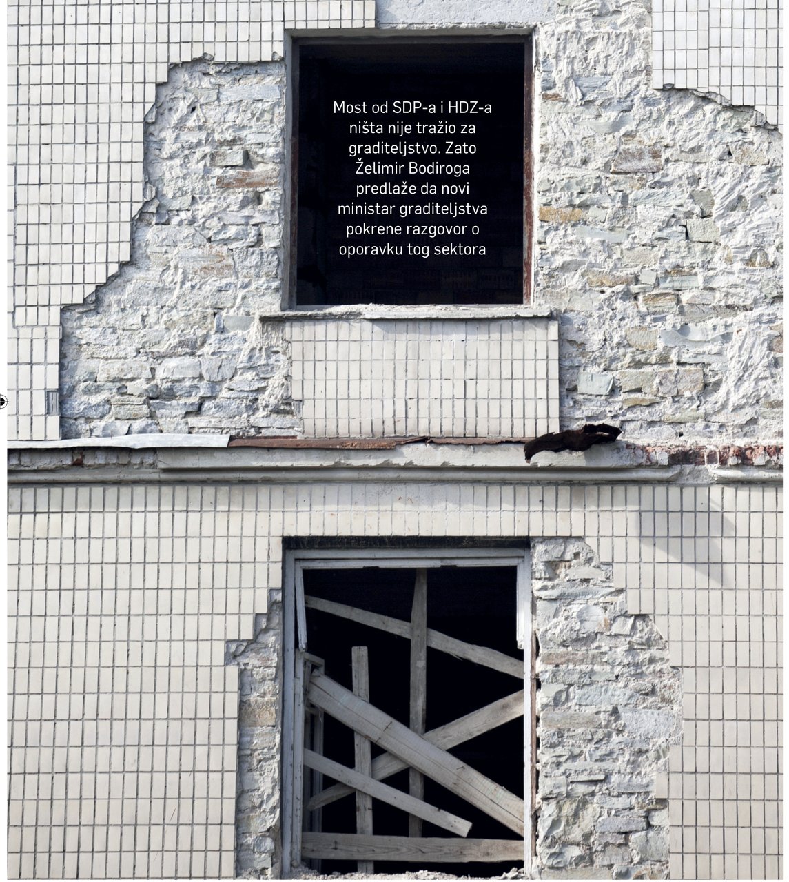 Most od SDP-a i HDZ-a ništa nije tražio za graditeljstvo. Zato Želimir Bodiroga predlaže da novi ministar graditeljstva pokrene razgovor o oporavku tog sektora. O gospodarskoj aktivnosti ovise i cijene nekretnina i općenito šansa da se domaća građevinska industrija izvuče iz živog pijeska iz kojeg se već dugo čupa. Vlasnik Kamgrada Dragutin Kamenski veli da će nam trebati još dvije do tri godine dok se cijene nekretnina ne stabiliziraju ili počnu rasti, a jedan od dvojice suvlasnika VMD prometa Antun Mikec misli da će nam možda trebati i do pet godina.