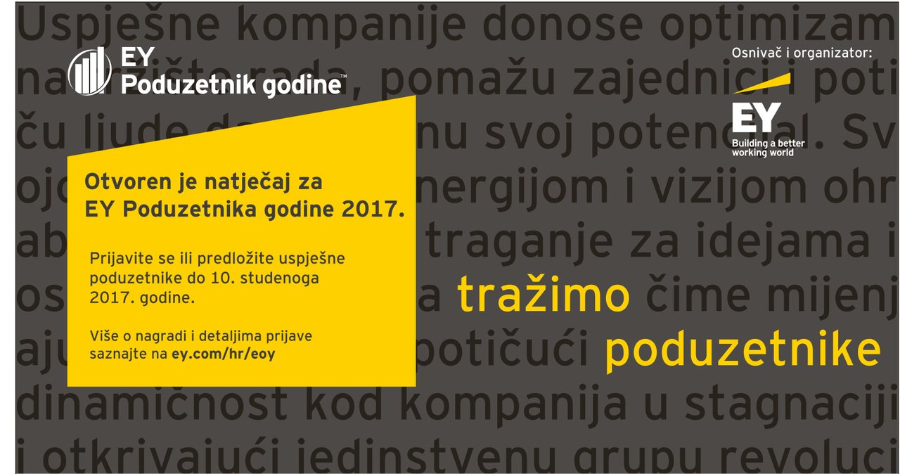 Uspješne kompanije donose optimizam na svakom rabi, pomažu zajednici i potiču ljude da izražavaju svoj potencijal. Svojim energijom i vizijom ohranjuju ideje i potiču poduzetnike. Otvoren je natječaj za EY Poduzetnika godine 2017. Prijavite se ili predložite uspješne poduzetnike do 10. studenoga 2017. godine.